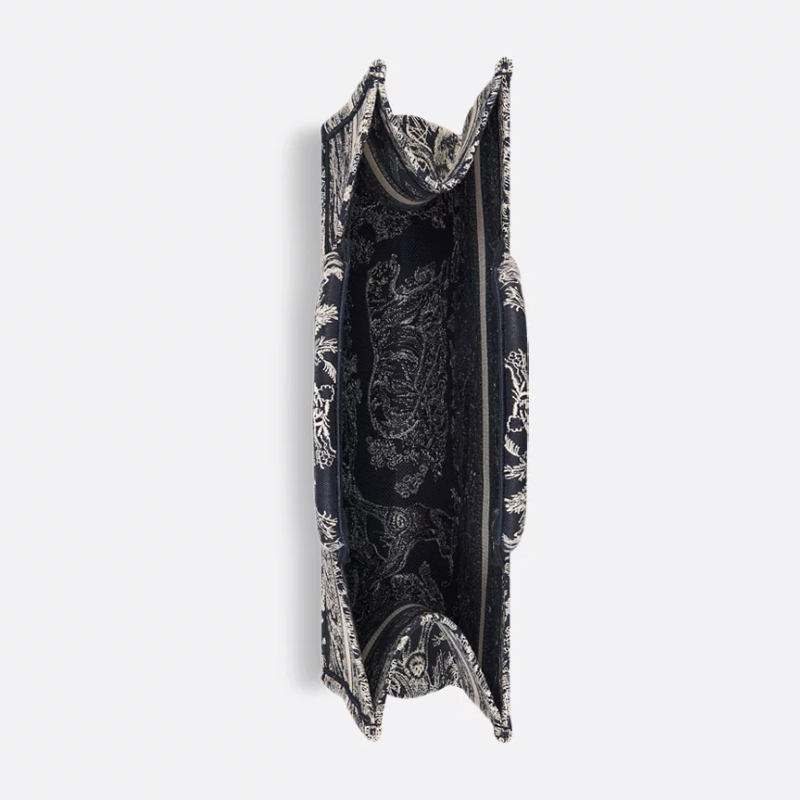 Este modelo, diseñado para guardar todos sus objetos básicos de diario, presenta un bordado integral con el motivo Toile de Jouy crudo y azul y la firma Christian Dior Paris en la parte delantera. El tote mediano es un ejemplo del savoir-faire emblemático de la Maison y puede llevarse en la mano o colgado del hombro.